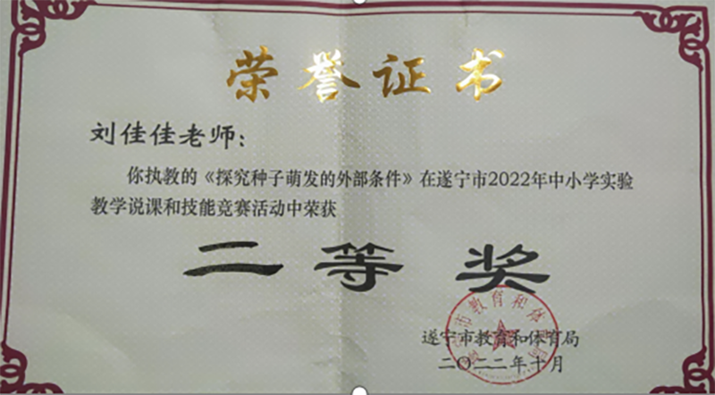 根据遂宁市教育和体育局关于开展 2022 年遂宁市中小学实验教学技能竞赛活动的通知,在遂宁市2022年中小学实验教学说课和技能竞赛活动中,遂宁一中选派的生物组岳菲老师获一等奖、刘佳佳老师获二等奖;物理组李川江老师获三等奖。岳菲老师以生物组全市第1名的佳绩将代表遂宁市参加2022年四川省中小学实验教学技能竞赛活动比赛。