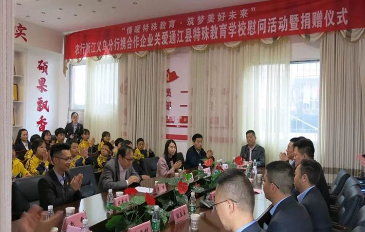 捐赠仪式上,农行浙江义乌分行携合作企业浙江国田服饰有限公司为通江县特殊教育学校捐赠现金贰万元。通江县特殊教育学校为爱心企业送上“热心公益事业,情暖特殊教育”的牌匾。