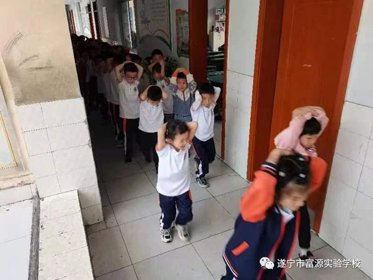 随着急促的警报声响起,各楼层值守人员迅速就位,各班班主任及科任老师指导同学们迅速躲避到课桌下。第二遍警报声一响,同学们用课本或双手护住头部,在老师们的引导下,按照原定路线有序安全地撤离教室,以最快的速度安全到达操场。整个演练过程用时1分15秒。
