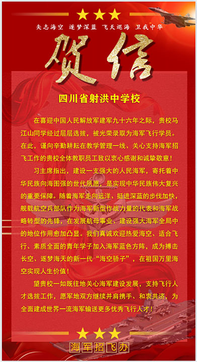 7月14日,海军招飞办向射洪中学致贺信,祝贺射洪中学马江山同学经过层层选拔,被光荣录取为海军飞行学员。据悉,马江山,今年高考594分,被录取为海军飞行学员,是射洪中学历史上第一人。海军招飞办感谢射洪中学对海军招飞工作的大力支持;希望射洪中学一如既往关心海军建设发展,支持飞行人才选拔工作,为建成世界一流海军输送更多优秀飞行人才。
