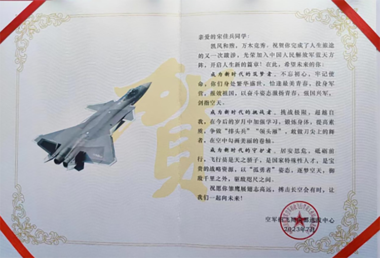 空军招飞局成都选拔中心向射洪中学发来贺信,祝贺射洪中学宋佳兵同学被中国人民解放军空军飞行学院录取。据悉,宋佳兵是今年射洪市唯一一位被中国人民解放军空军飞行学院录取的学生。雏鹰展翅志高远,搏击长空会有时。空军招飞局成都选拔中心希望宋佳兵同学成为新时代的筑梦者、挑战者、守护者。