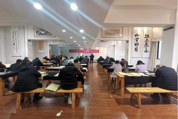 本期培训班采用集中面授和分组临摹创作、交流相结合的培训方式。来自全县中小学校的52名书法教师和书法爱好者参加了为期3天的集中培训。