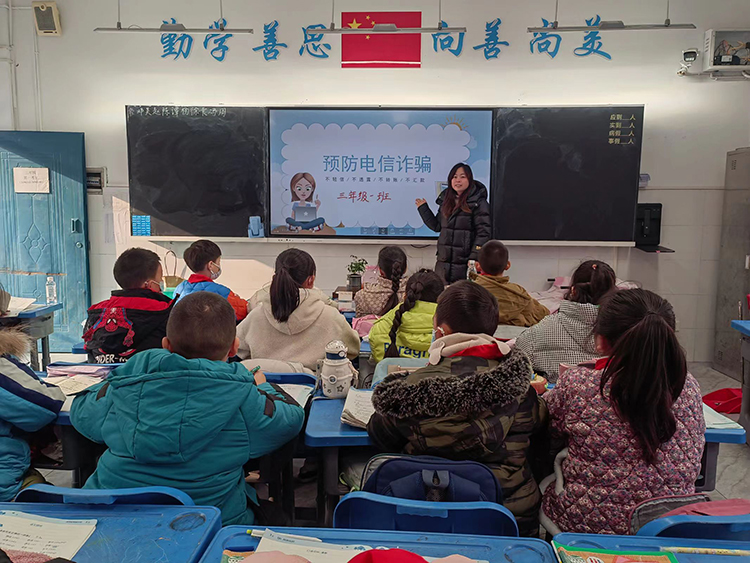 在班会课上,老师们当前常见的电信诈骗手段、特点、形式和危害,从冒充QQ好友、盗用微信、电话;网上充值币、购买点卡、游戏账号;网上中奖信息等具体诈骗手段,结合身边的真实案例对学生进行告诫与提醒,并告知学生该如何识别与防范这些违法诈骗行为。同时,让孩子们在校学习相关知识,回家之后,将所学、所知的告诉家长,通过小手牵大手,提醒家长们也应谨防电信诈骗。