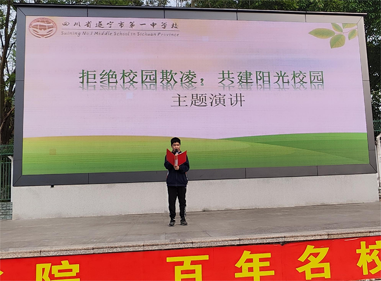 校园是一方净土,而校园欺凌则是其中不和谐的音符。无论是欺凌者、被欺凌者还是旁观者,都会在校园欺凌中受到身心伤害。为构建阳光校园,防止校园欺凌事件发生,增强学生法制意识,提高学生自我保护能力,遂宁一中开展了以“拒绝校园欺凌,共建阳光校园”为主题的国旗下活动。