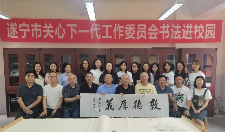 5月10日下午,遂宁市关心下一代工作委员会及遂宁市书法家协会的领导和艺术家们到射洪市第四小学校开展“书法进校园”活动。学校唐敏老师为师生代表进行了书法知识培训,上官秀巍、高远树、吕荣国、李太荣、刘仕国等书法家们挥毫泼墨、笔走龙蛇,为学校书写了文化理念和箴言等一幅幅精妙的书法作品,并为现场的老师和同学们赠送墨宝,其深厚笔力让大家赞叹不已!此次活动让师生们深深感受到书法的魅力,更加热爱书法!