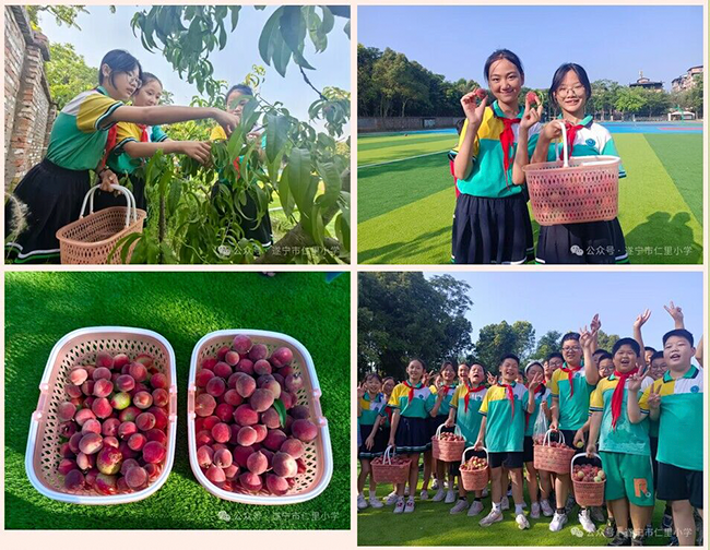 六年级的同学们迎来了一次果园采摘之旅。同学们在老师的带领下,来到学校的桃园。同学们小心翼翼地采摘着成熟的桃子,经过彻底清洗后,按照数量分发到各个班。