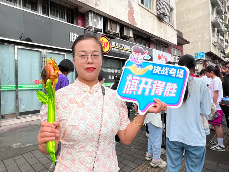家长们、老师们身着旗袍,捧着向日葵,他们用各种花式祝福为考生打气助威。愿旗开得胜,一举夺魁!