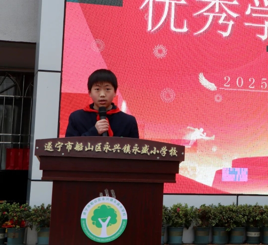 在热烈的掌声中,六一班的杜有财同学作为获奖学生代表,自信满满地走上发言台。他的话语质朴而真挚,将自己在学习与生活里的点滴感悟娓娓道来。谈及未来,杜有财同学目光坚定,充满激情地呼吁同学们,在即将开启的新学期,锁定目标,心无旁骛,用勤奋的汗水浇灌知识的种子;团结身边的伙伴,凝聚集体的力量;大胆突破常规,以创新的思维开辟前行的道路。秉持着“我命由我不由天”的豪迈壮志,勇敢地迎接每一个新挑战,奋力书写属于自己独一无二的精彩篇章。