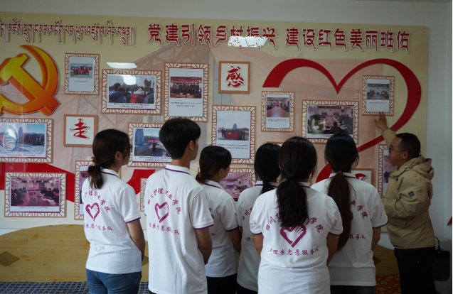 实践团来到班佑村乡村振兴陈列室,在学院驻村工作队队员包锐老师的带领下,从“党建引领乡村振兴 建设红色美丽班佑”“健康服务暖人心 康养班佑惠民生”两个板块了解班佑村的建设发展,感受学院定点帮扶的成效。