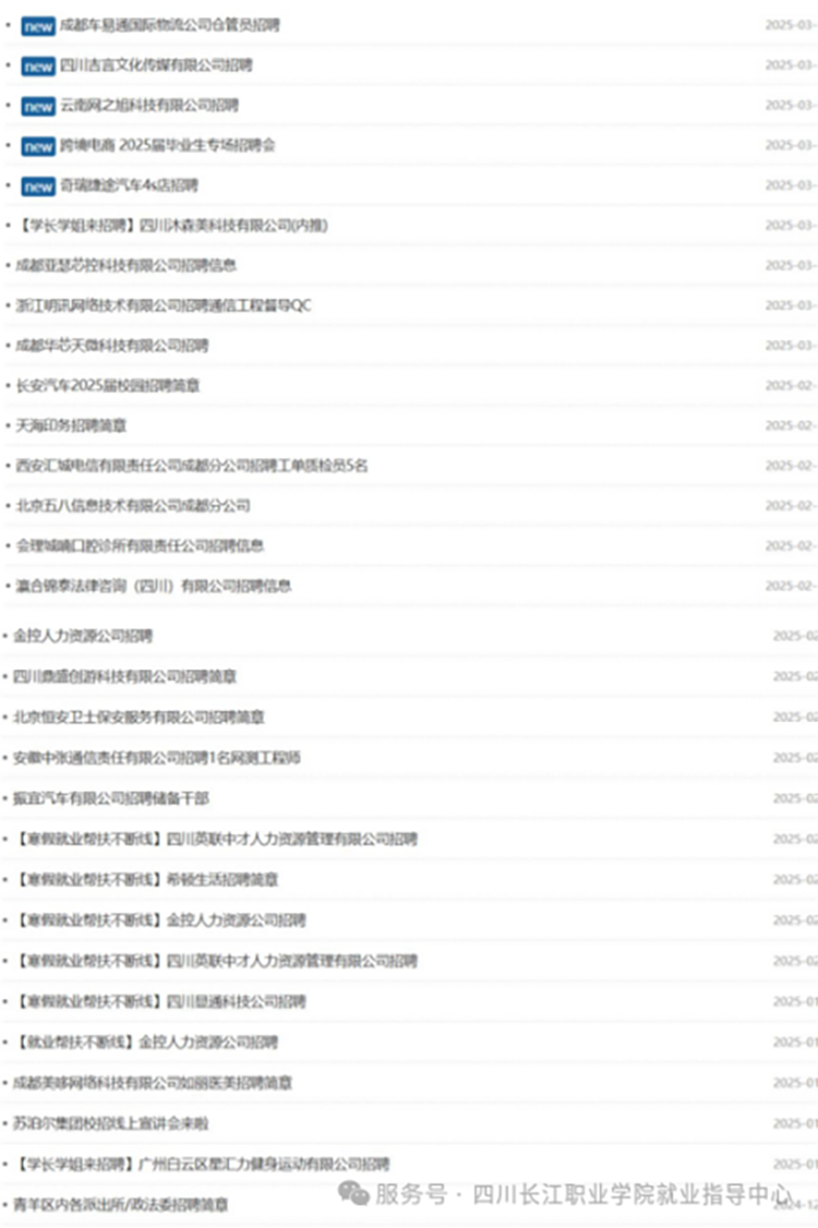 新春之际,四川长江职业学院就业指导中心向2025届毕业生发出了一封温馨的信件,鼓励学生们提前规划职业生涯,积极参与求职面试,早日落实工作。信中不仅分析了当前就业形势,还提供了实用的求职建议和寒假求职活动,引导未就业同学积极就业,已就业同学踏实工作,稳定就业,追求长远发展。另外,就业指导中心也对企业伙伴过去的支持表示感谢,期待来年继续合作共赢,为职教人才培养共同携手,谱写产教合作、就业育人新篇章。