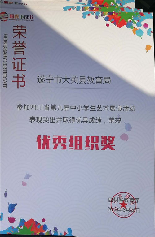 此次艺术展演活动,经过激烈的角逐,大英县选送的艺术作品荣获一等奖1名,二等奖3名,三等奖2名;艺术案例二等奖1篇,三等奖1篇;艺术工作坊一等奖1所。取得如此成绩,这彰显了大英县近年来学校艺术教育的新成就,迈开了学校特色教育的坚实步伐。