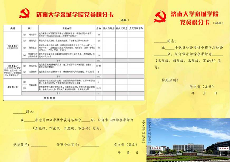 近日,由学校文化与传媒学院广告设计专业的学生党员参与设计的党员积分卡新鲜出炉。积分卡不再是一张干巴巴的数据表,而是分为正联和副联。正联记录党员每年的积分考核情况,党支部存档;副联是党员每年的星级评定证明,加盖支部印章。党员离校时,副联会作为纪念卡赠送给党员,也是一份记录党员个人成长史的礼物。
