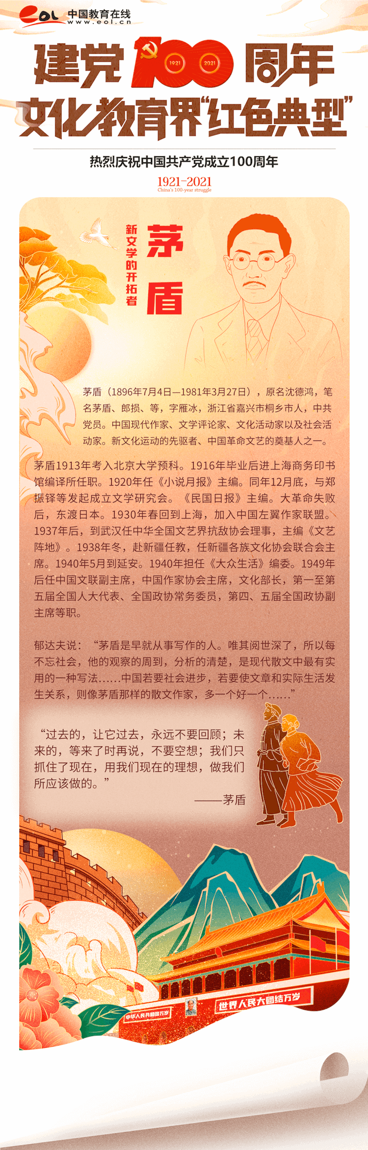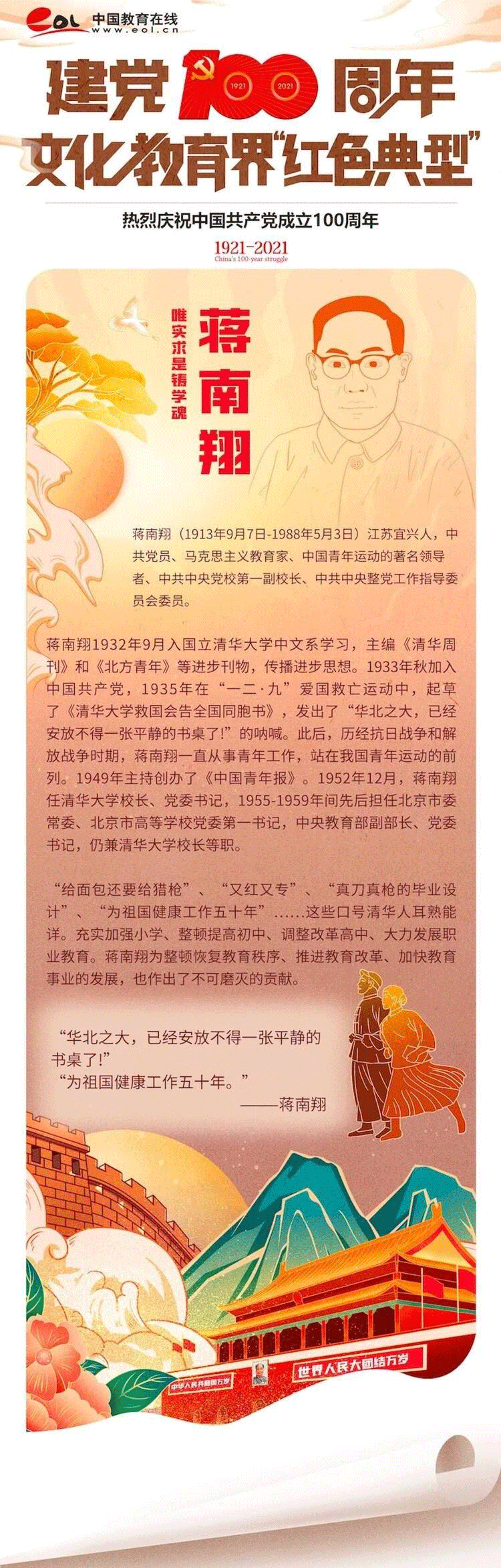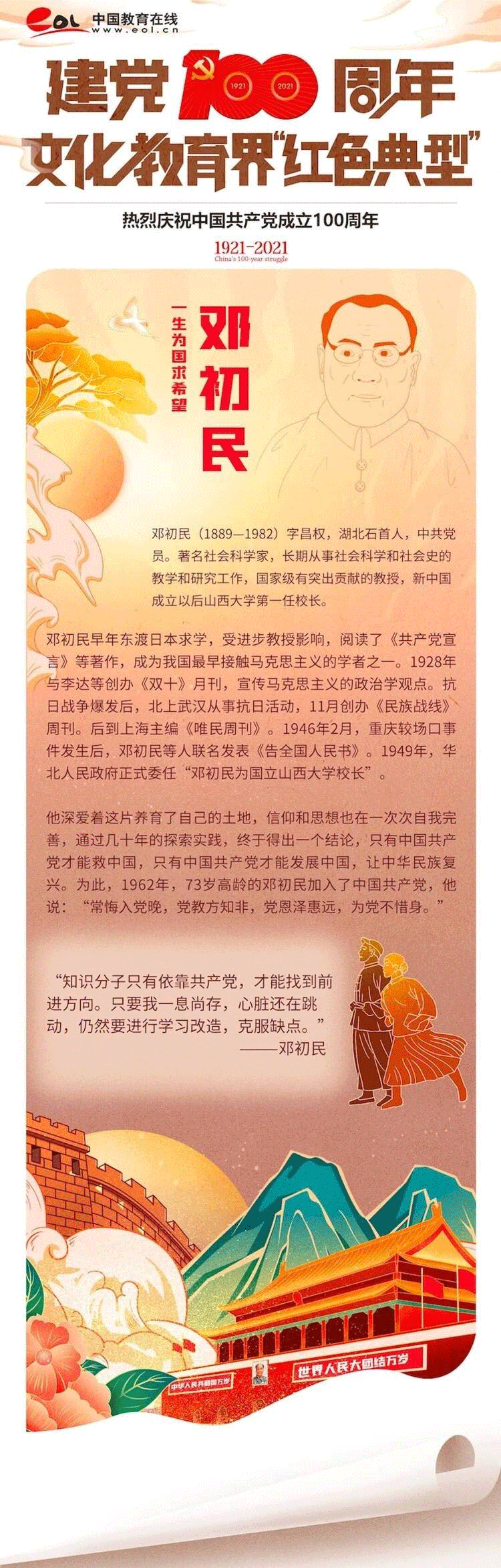 他们风华正茂,他们诲人不倦,他们博学多才,他们矢志不渝...他们伫立在时代与变革的浪尖,他们用思想与灵魂,书写文化教育界的历史篇章。百年奋斗,百年风华,让我们一起来认识在党的百年征程中那些熠熠生辉的“红色典型”。