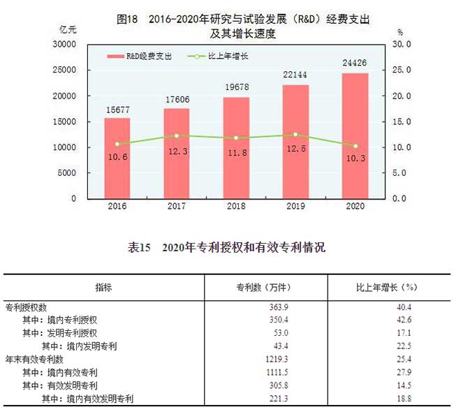 公报显示,全年研究与试验发展(R&D)经费支出24426亿元,比上年增长10.3%,与国内生产总值之比为2.40%,其中基础研究经费1504亿元。国家科技重大专项共安排198个项目(课题),国家自然科学基金共资助4.57万个项目。截至年末,正在运行的国家重点实验室522个,国家工程研究中心(国家工程实验室)350个,国家企业技术中心1636家,大众创业万众创新示范基地212家。国家级科技企业孵化器1173家,国家备案众创空间[55]2386家。全年授予专利权363.9万件,比上年增长40.4%;PCT专利申请受理量7.2万件。截至年末,有效专利1219.3万件,其中境内有效发明专利221.3万件,预计每万人口发明专利拥有量15.8件。全年商标注册576.1万件,比上年下降10.1%。全年共签订技术合同55万项,技术合同成交金额28252亿元,比上年增长26.1%。
