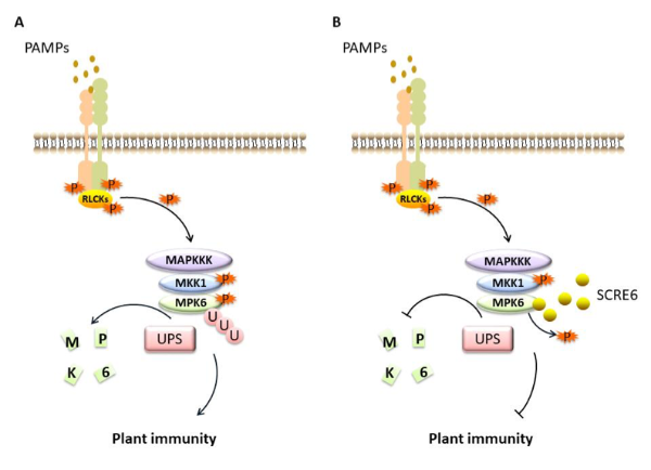 该研究以稻曲病菌富含半胱氨酸蛋白SCRE6为研究对象,证实了SCRE6是稻曲病菌中发挥重要毒性功能的效应蛋白;通过生化实验揭示了SCRE6是一个以水稻免疫负调控因子OsMPK6(Mitogen-Activated Protein Kinase 6)为靶标的酪氨酸蛋白磷酸酶。当病原菌侵染时,水稻识别PAMP后诱导OsMPK6的磷酸化,促进其通过26S蛋白酶体途径降解而激活水稻抗病性。而稻曲病菌分泌的SCRE6能特异性去磷酸化OsMPK6,进而抑制OsMPK6降解,该蛋白积累促进稻曲病菌的侵染;此外,在稻曲病菌中还发现3个SCRE6同源蛋白,与SCRE6构成一类新型酪氨酸蛋白磷酸酶家族。该研究揭示了稻曲病菌致病的新机制,并为通过基因编辑技术创制水稻抗病新种质提供了思路。