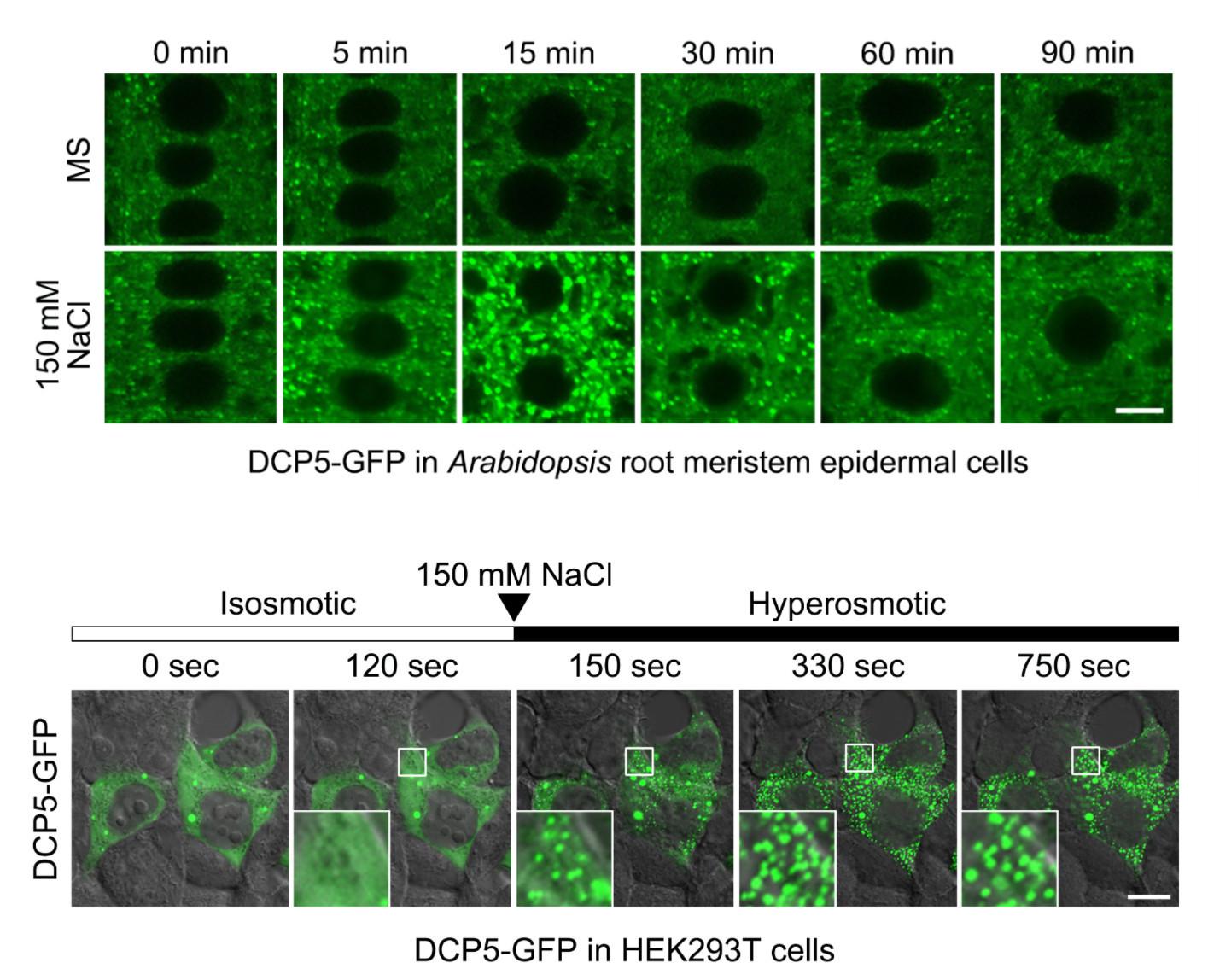 图1 渗透胁迫诱导DCP5发生迅速可逆的凝聚