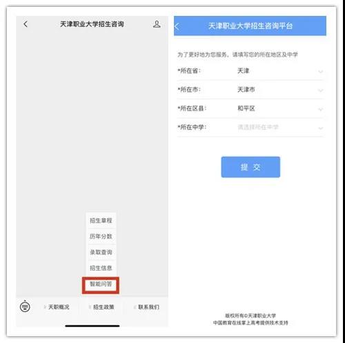 在微信公众号中搜索并关注“天津职业大学招生咨询”或识别微信二维码(如图六)。进入公众号页面。点击下方“招生政策”模块(如图七),点击“智能问答”跳转至天津职业大学招生咨询平台,填写好基本信息后点击提交,即可进行提问。(如图八)