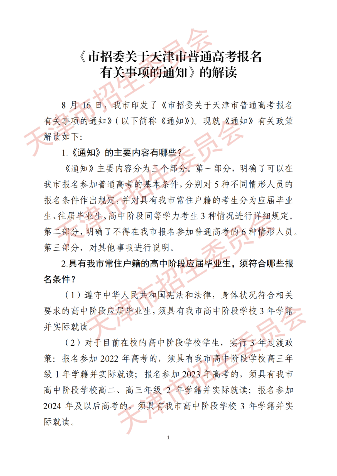 《市招委关于天津市普通高考报名有关事项的通知》的解读