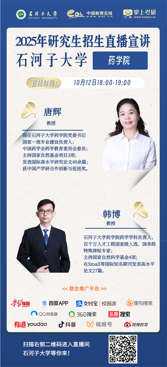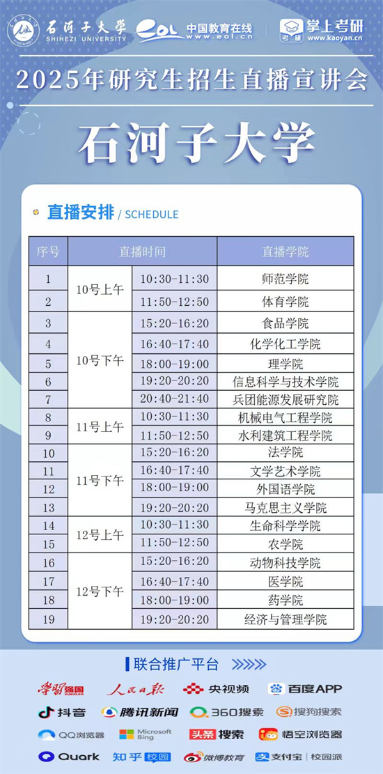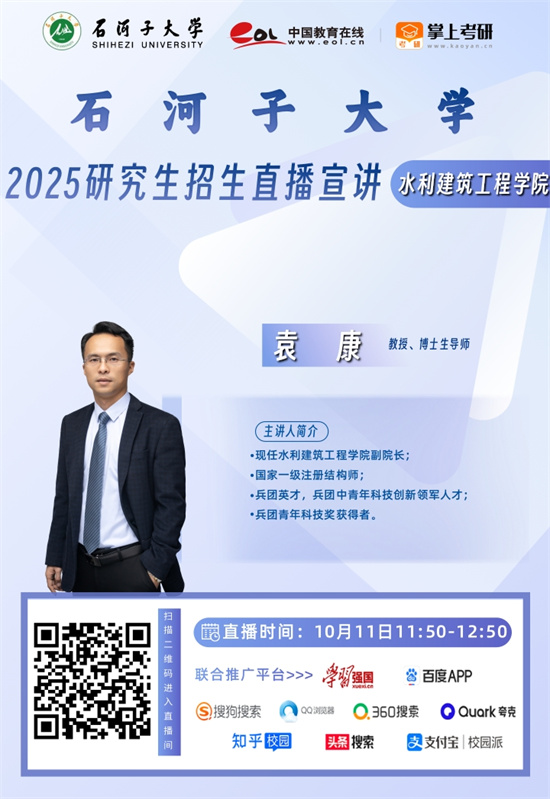 亲爱的同学们,万众瞩目的时刻正悄然逼近!石河子大学2025年研究生招生直播宣讲盛会,于2024年10月10日、10月11日、10月12日在云端与您激情碰撞,共赴知识的盛宴!
