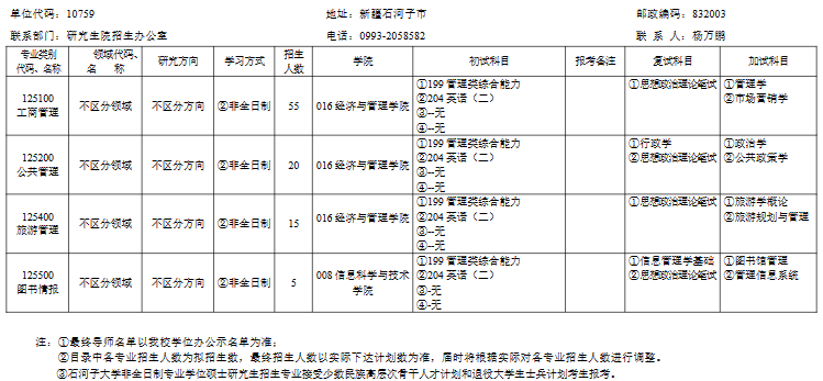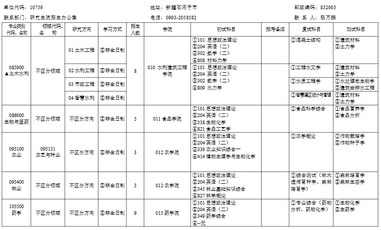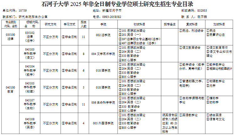 石河子大学2025年非全日制专业学位硕士研究生招生专业目录