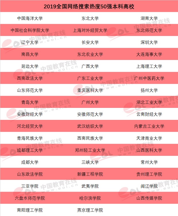 此次评选出的“2019年全国网络搜索热度50强高校”榜单,主要采纳金宝搏188入口 高招智能问答系统、全国高校招生数据库搜索排名等数据中来自全国各个省份高中生的搜索、提问和评论数据,对以上指标进行不同权重的加权分析后,最终评选出全国2019年网络搜索热度高校(本科/高职)榜单。在此项公布的榜单中,云南财经大学获评“2019年全国网络搜索热度50强本科高校”。