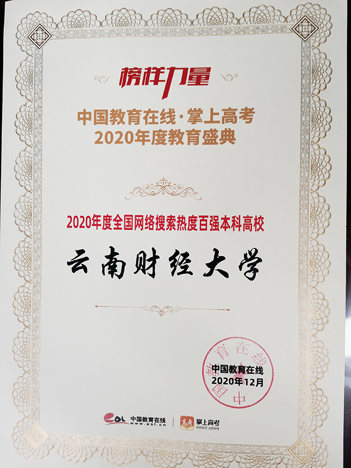 近日,金宝搏188入口 ·掌上高考“榜样力量——2020年度教育盛典”评选获奖名单揭晓,云南财经大学获“2020年度全国网络搜索热度百强本科高校”荣誉称号。