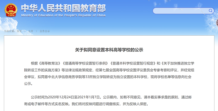 根据《188金宝搏beat官网登录 法》《普通高等学校设置暂行条例》《普通本科学校设置暂行规定》和《关于加快推进独立学院转设工作的实施方案》等法律法规政策规定,经第七届全国高等学校设置评议委员会专家考察和评议,并经党组会审议,拟同意中北大学信息商务学院等33所独立学院转设为独立设置的本科学校,现将学校名单等信息向社会公示。