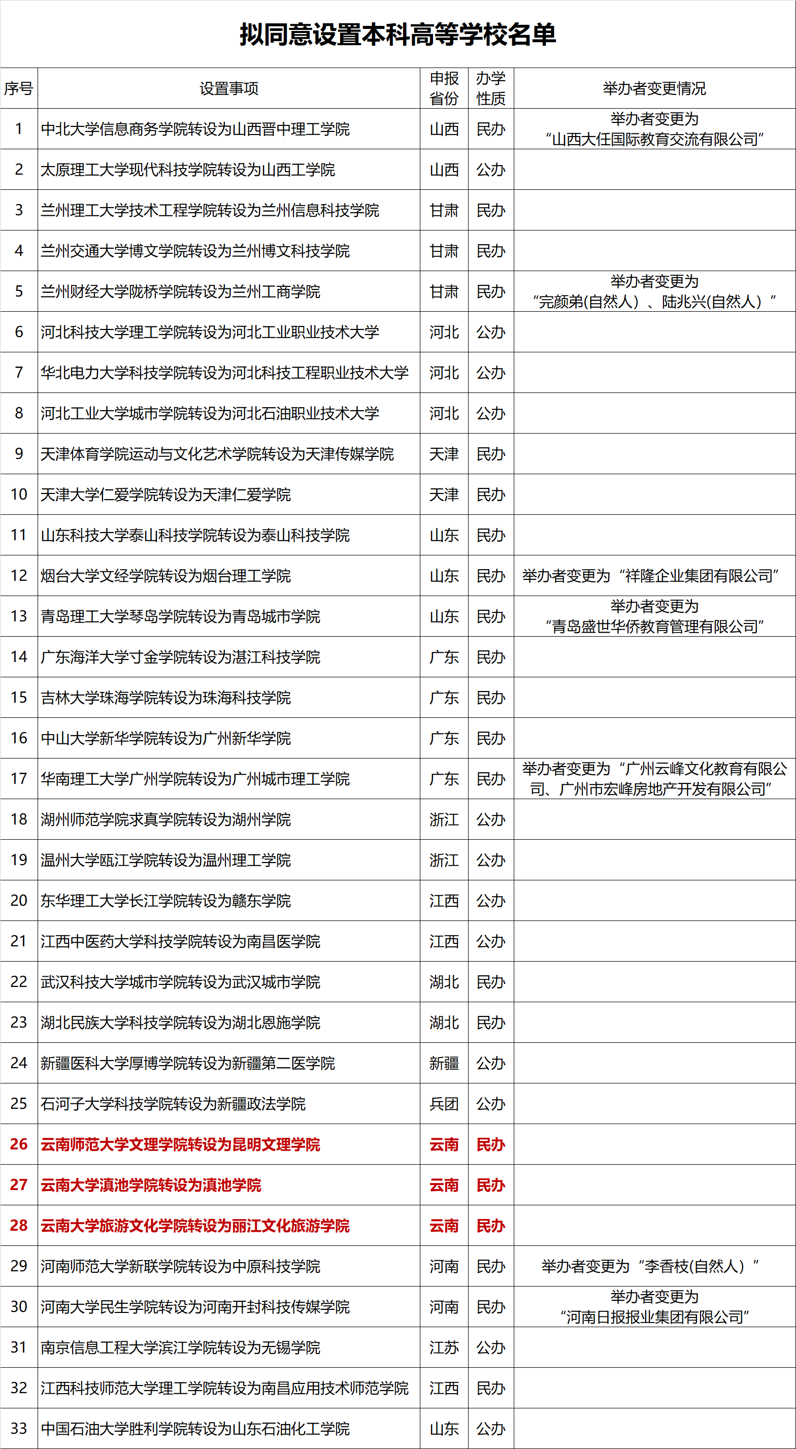 云南3所!金博宝最新官方网站查询网址 公示33所独立学院转设名单