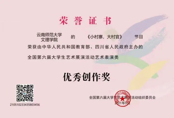 2021年5月12日,由昆明文理学院(原云南师范大学文理学院)学前教育专业师生选送的原创舞蹈作品《小村寨,大村官》获得了全国第六届大学生艺术展演活动艺术表演甲组一等奖、艺术表演类优秀创作奖,并作为云南省舞蹈类唯一的代表节目参加了展演开幕式的入场仪式。
