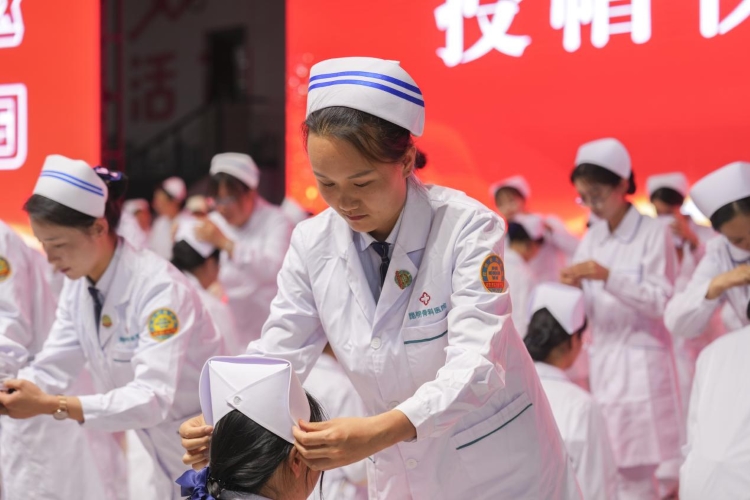 护理专业的学子有序上台,云南大学附属医院、云南省妇幼保健院、云南省传染病医院、云南省老年病医院、昆明市第二人民医院、昆明骨科医院、官渡区矣六街道社区卫生服务中心护士长代表和学校教师一同为同学们戴上了圣洁的燕帽,点燃了代表“提灯女神之光”的烛灯,象征着崇高理想得以光荣传承,同学们庄严地宣誓:“坚决为护理事业奋斗终身!”