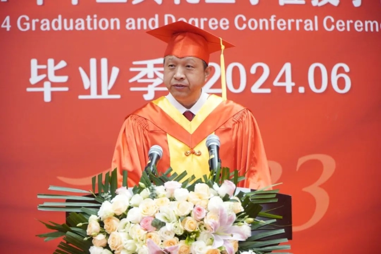 校长夏雪山在典礼上致辞,向圆满完成学业的毕业生表示热烈祝贺。他说道:“过去几年,我们共同见证、参与了学校改革建设发展,一起亲身参与见证了学校建校90周年,学科学位点及专业建设、科技创新等各项事业取得新突破,海棠、丹桂书苑、博物馆、游泳馆、体育馆建成开馆,足球场提升改造、人行天桥通行……回眸校园生活,你们勤奋刻苦,你们丰富多彩,一幅幅珍贵的画景,勾勒着你们的成长与蜕变。毕业,是新的开始,是奔赴理想,是来日方长,作为昆医学子,你们承载着学校的期望,更承载着伟大的时代使命。”他寄语毕业生们,要胸怀理想,把握正确的人生航向,让蓬勃青春与家国情怀同频共振,做新时代有理想的航行者。要笃行不怠,向李秉权、胡素秋、蓝瑚等历代医者学习,坚定救死扶伤的道术、砥砺心中有爱的仁术、夯实知识扎实的学术、掌握本领过硬的技术、提升方法科学的艺术,做新时代人民健康的守护者。要勤于学习,求知问真、与时俱进、革故鼎新,做新时代终身学习的探索者。要踔厉奋发,以青春之我攀卓越之峰,以梦想之我越现实之境,以日新之我创时代之新,做新时代勇于争先的奋斗者,为中国式现代化奋力书写青春篇章。“请不要相信,胜利就像路边的蒲公英一样,唾手可得;但请相信,世界上总有一些梦想和美好值得我们全力以赴。”夏雪山祝愿同学们前程似锦,“医”路顺风。