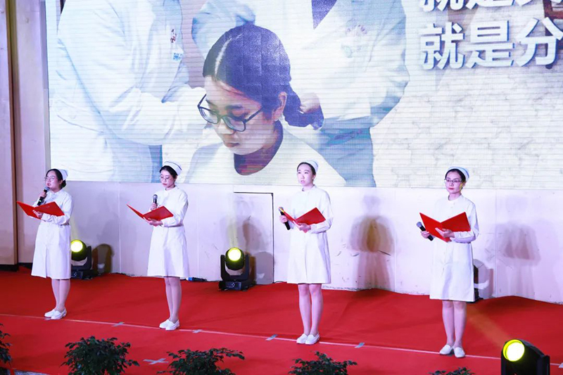 康复与护理学院院长商艳霞带领全体护理毕业生庄严宣誓,愿每一位护理人都能守护人民健康大计。无暇的内心,柔情的歌喉,合唱《中国护士之歌》是对白衣天使的赞美与厚爱,唱出了医护人员的大爱与无私奉献。