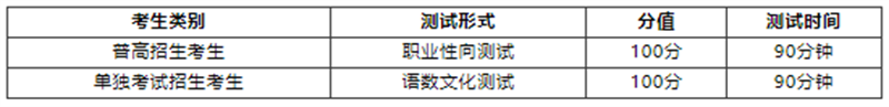 校考综合素质测试实行分类命题、分类评价。各专业普高招生考生进行职业性向测试,重点考核职业适应性;单独考试招生考生进行语数文化测试,重点考核文化素质。测试成绩四舍五入保留两位小数。具体测试规则如下: