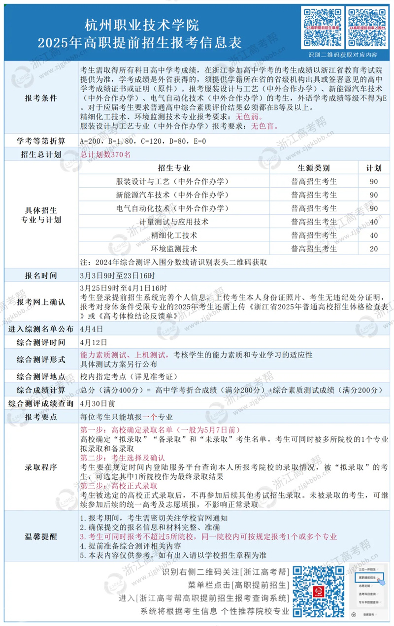 为了帮助考生了解院校资讯,掌握报考信息,我们将陆续推出高职提前招生报考专刊,内容包含招生计划、报考条件、报名方法、综测形式与内容、总成绩构成等关键报考信息。今天,我们推出杭州职业技术学院,一起来看!