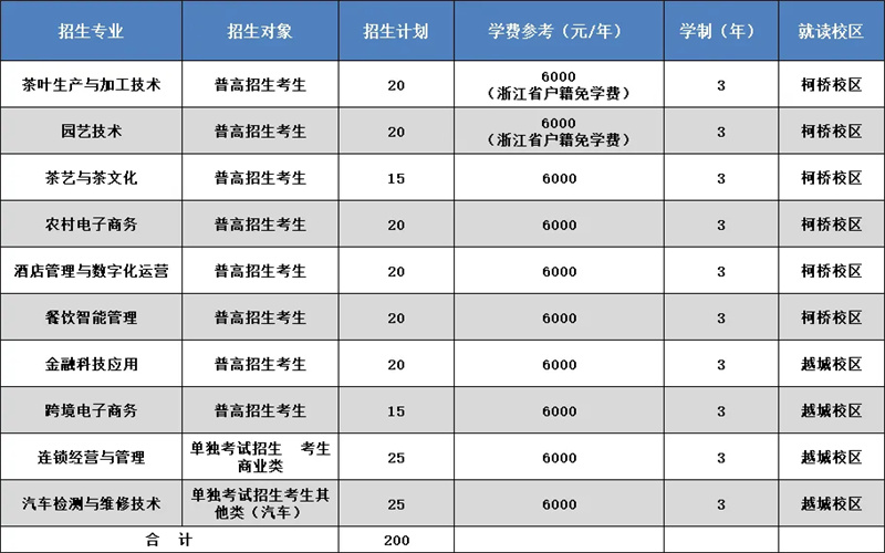 学校2025年面向浙江省高职提前招生计划200名,招收普高招生考生和单独考试招生考生,具体招生计划如下: