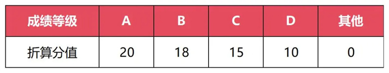 从高中学考的10门科目中选取语文、数学、外语和其他等级最高的2门科目组成,总分100分。对通用技术和信息技术科目取该考生等级较高的一项成绩计为高中学考技术科目的等级成绩。具体折算分数如下表。