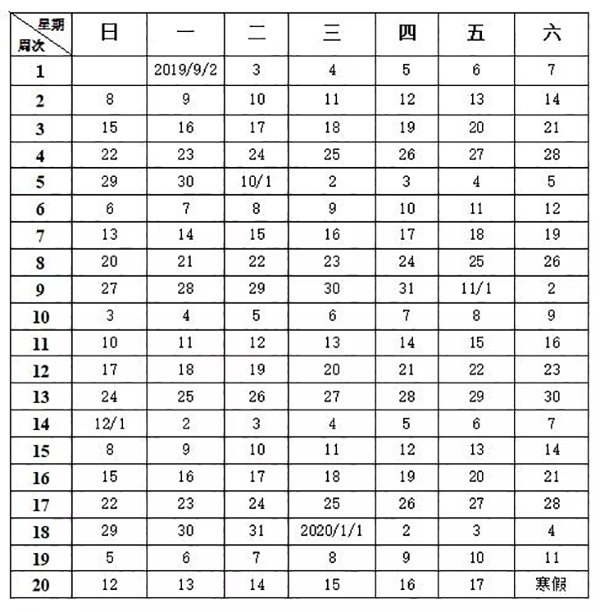2019学年第一学期:义务教育学校2019年9月1日报到,9月2日正式上课,2020年1月18日寒假开始。