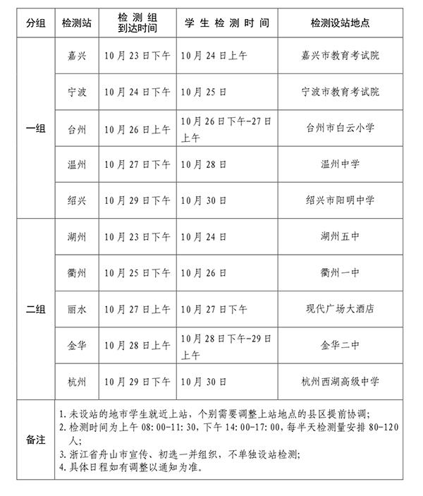 2019年10月23日至30日,学生在站检测时间为半天,上站时间为上午 8:00、下午14:00。各地市具体检测时间见下图↓↓↓