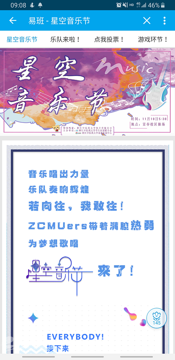 此外,学校两校区还建立易班发展中心实体办公场地,在维护“浙中医大·易班”平台的同时,积极发挥“易班”平台的网络宣传优势,传播主流思想,创新开展学生活动,主办“星空音乐节”,协办“社团纳新”活动、“公益海报”大赛,计划开展“易瞄瞄表白浙中医大”活动,根据不同活动的内容自主设计轻应用接入“浙中医大·易班”,通过线上互动与线下活动相结合,不断提升活动的吸引力,提高活动的亲和力,增强活动的影响力。各二级学院均已建立学院易班主页、微社区,协同做好网络育人。