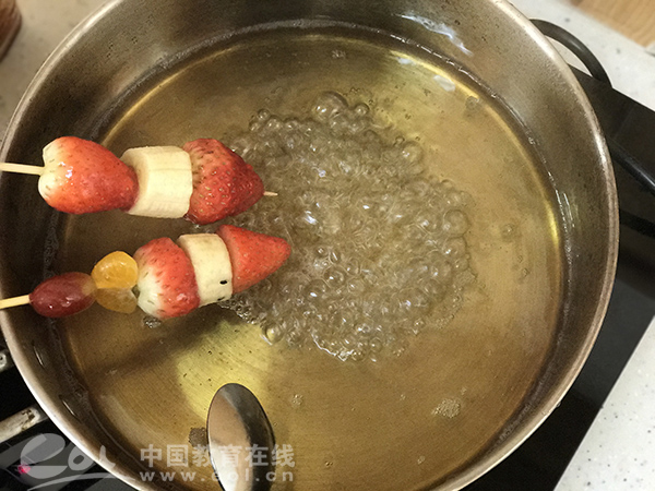 串完糖葫芦,孩子们准备给糖葫芦穿糖衣,老师们教孩子给糖葫芦穿糖衣,拿这葫芦在糖水里滚一滚,用勺子在山楂上浇上糖,冰糖葫芦就大功告成。