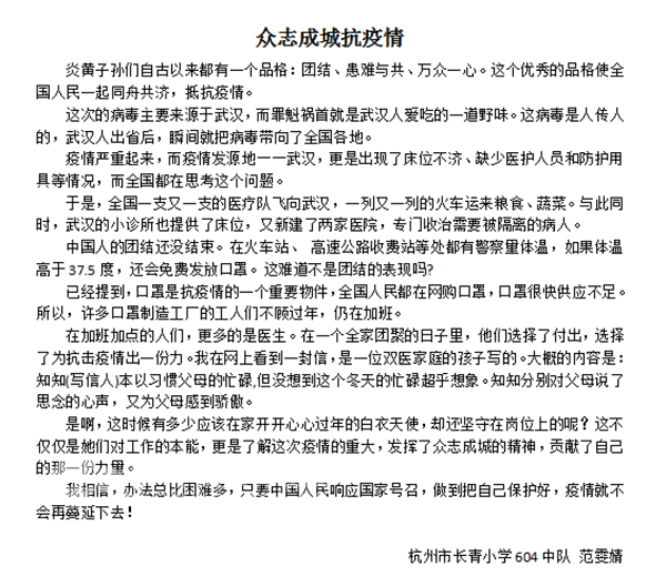 金宝搏188入口 浙江站讯(记者 叶晨曦 通讯员 李秀群)在这个特别的鼠年春节里,一群勇敢的白衣天使们正义无反顾地奋战在最危险的一线,长青队员们担心又关心着他们……就在这样的日子,队员们接到了来自学校大队部的一项特殊的任务——思考“我们能为打赢这场战争做些什么?”于是长青的队员们积极地展开了思考:什么是冠状病毒,如何预防?
