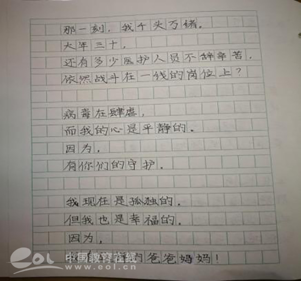 早饭后,爸爸陪我一起观看了李兰娟院士的采访视频,李院士说现在确诊人数增加快是因为我们检测手段先进了,能够很快检测出有没有被感染,而且我们已经成功分离出了病毒株,很快就能研制成功疫苗。还看了钟南山院士的采访视频,钟院士说预计疫情1周或10天左右达到高峰,后面就会逐步降下来,疫情就慢慢控制住了。还给我看了在武汉一线与病毒作斗争的医生护士们的视频,他们来自全国各地,有的家人生着重病,有的孩子还很小,还有的已经准备退休了,但他们都奋不顾身地投入到与病毒的斗争中,他们长期坚持工作,脸上都由于长期戴口罩捂出了水泡,却还是带着笑容,充满了战胜疫情的信心。