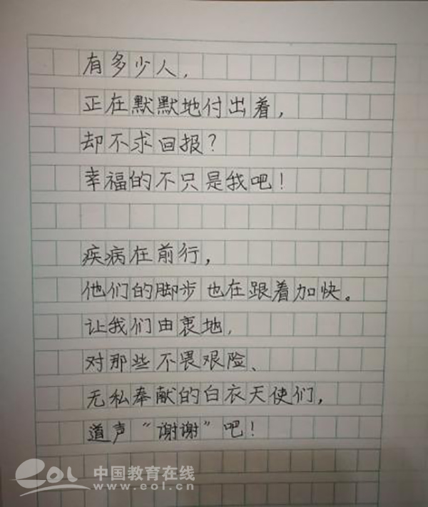 有感于目前一场突如其来的新冠肺炎在全国蔓延,武汉的情况最为严重,健康的我们待在家里通过电视或网络,看到了战斗在防疫一线的医护人员们,有钟南山院士、李兰娟院士、武汉当地的,浙江及各地驰援武汉的奉献者。他们为了控制疫情,不顾自身安危,争分夺秒地与病毒进行这场没有硝烟的战争。