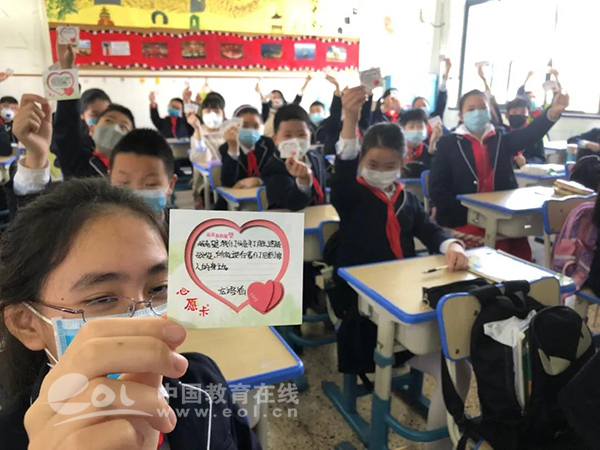 班主任早早在教室欢迎孩子们,并分发给每一位孩子“复课”礼包。礼包中放着两张珍贵的卡,由学生在仪式感中去学会表达和立志。感恩卡送给疫情期间最想感谢的人;心愿卡写下新学期新愿望。