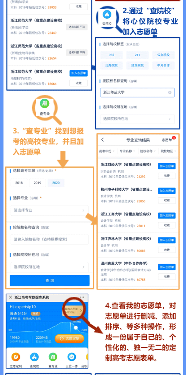 金宝搏188入口 浙江站讯 (实习编辑 刘嘉慧)分数考得好≠能上好学校,分数考不好≠就上差学校,关键还得看志愿怎么报!2020年7月29日-30日的首轮志愿填报进入倒计时。如果填80个平行志愿还没有头绪,那么一定要用【浙江高考帮高考志愿推荐匹配系统】(浏览器输入www.zjgkbbb.cn,可使用电脑端)。帮你理清一团乱麻的高考志愿,效率翻倍!