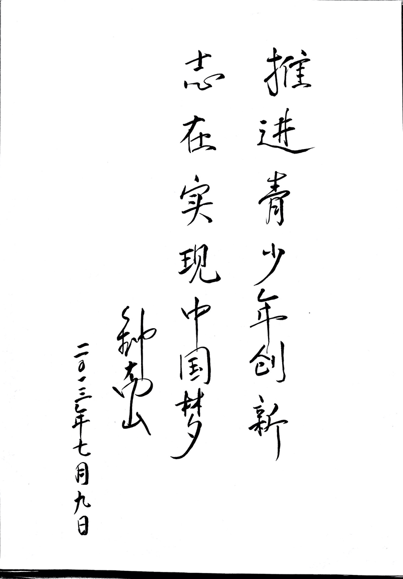 钟南山院士一共问了30多个问题,罗凡华主任全部回答后,钟南山院士高兴的签署了两个重要文件。在《关于设立“钟南山创新奖建议”》文件上,批示:同意设立“钟南山创新奖”,可使用本人姓名及肖像,钟南山2013.7.9。钟南山院士亲笔题字:推进青少年创新,志在实现中国梦,钟南山二O一三年七月九日。