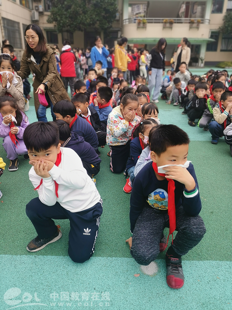 本次演练共分为火灾报警、火场疏散、灭火救援、常见火灾扑救、消防员与学生互动五个环节。火警警报拉响后,北校区全体学生在老师的带领下,进行人员疏散,并迅速报警。同学们用湿毛巾或湿纸巾捂住口鼻,采取弓腰低身的姿势有序撤离至小操场。