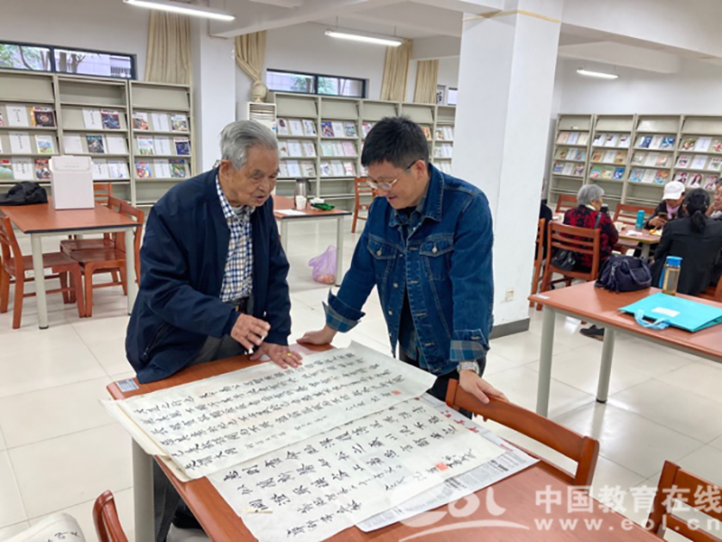 老师们茶话叙旧,其乐融融。95岁的沈斌老师还特意为我们带来了自己的书法作品,看着这些依然遒劲有力的字体,大家连连称赞。沈老师的作品现被珍藏在学校,并放置在学校文化长廊与学生作品一同展出。这不仅是老前辈们对学校的一份珍贵心意,折射出他们孜孜不倦的追求和美好的心灵,更是能让学生能感受到老前辈们 “老有所学、老有所为、老有所乐”的精神气,激励师生学习。