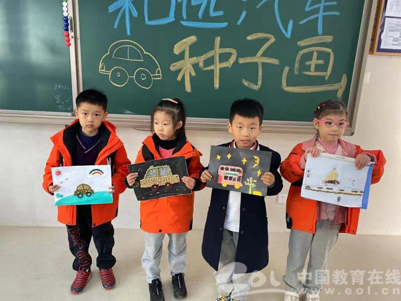 一年级用不同的种子创作色彩斑斓的“种子汽车”;二年级将生活中的废旧材料巧变“环保小车”;三年级用超轻粘土、牙签等材料制作“精美车轮”;四五六年级则是用所学知识,借助皮筋、马达等材料制作“动力小车”。