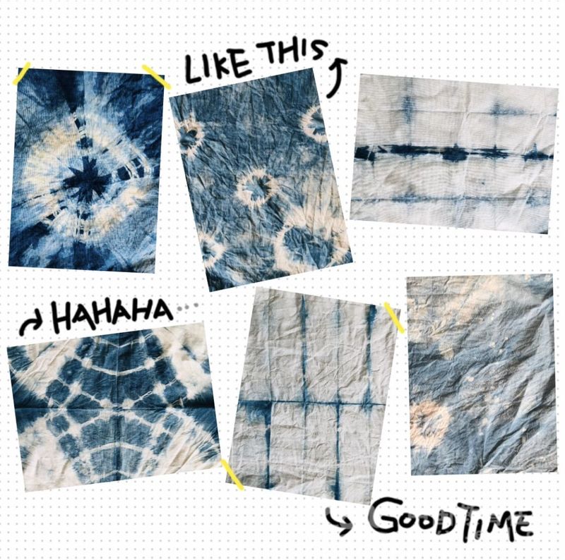 探索并没有止步于此,孩子们还想尝试挑战另一种传统染法——扎染。在开始之前孩子们先对扎染进行了初步了解,接着混合蓝靛泥和还原剂调制作成扎染染料。运用皮筋、弹珠等工具扎捆棉布,用清水打湿扎好的棉布,再将棉布放入染料中等待十分钟,十分钟后将棉布从染料中拿出,让棉布与空气进行充分的氧化反应,从而使青色的棉布变成了蓝色。反复几次后,孩子们将皮筋取下,晾干棉布,一块块花纹各异的扎染花布就诞生了。